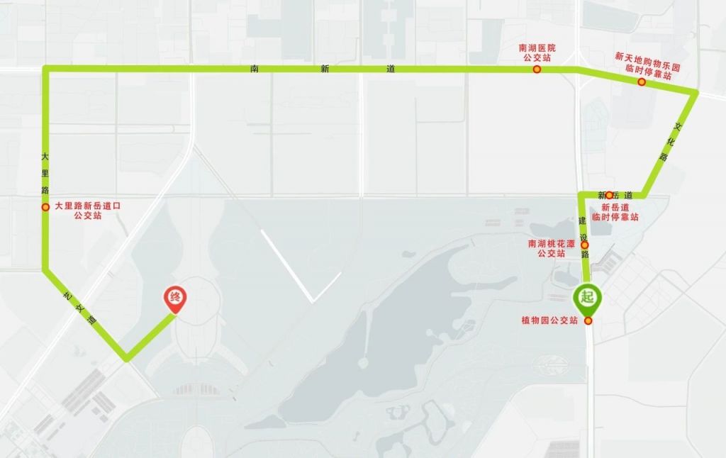 植物园公交站(南湖美食广场停车场)-南湖桃花潭公交站(影视基地停车场)-新舟道临时信靠站-文化路-新天地购物乐园临时信车点-南湖医院公交站(新天地购物乐园、美泰家世界)-大里路新岳道口公交站(同心广场停车场、九中地下停车场)-演出场馆(一号停车场指定地点)