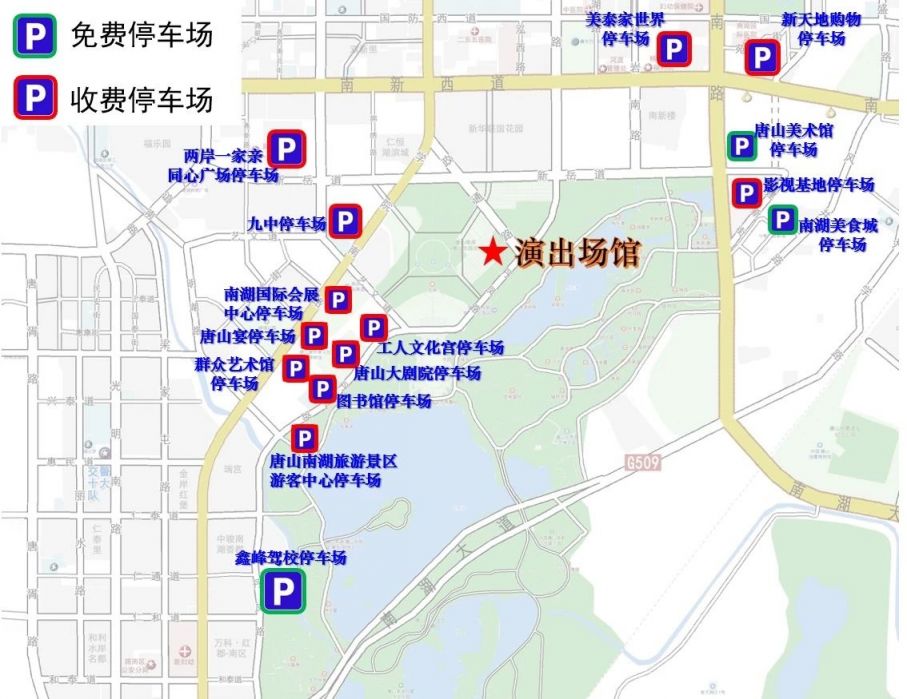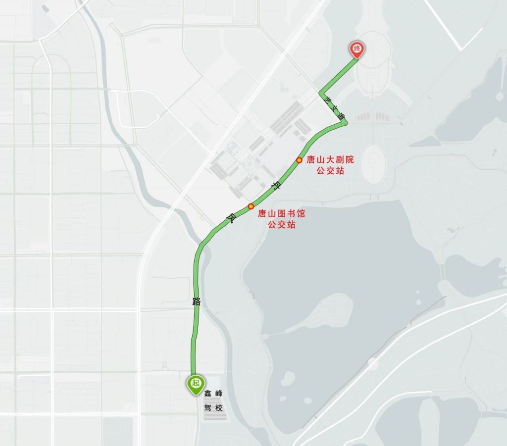 鑫峰驾校停车场-丹凤路-唐山图书馆(唐山南湖旅游景区游客中心、唐山宴周围停车场)-唐山大剧院(唐山宴周围停车场)-艺文道-演出场馆(一号停车场指定地点)