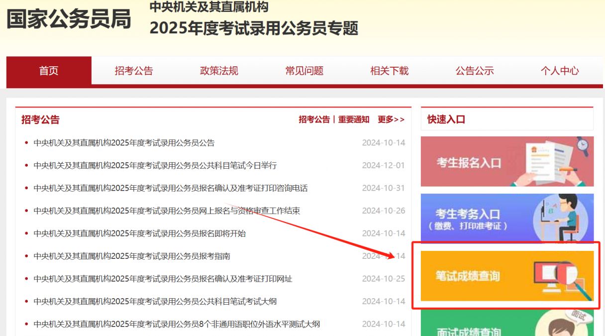如下图所示,进入国家公务员局中央机关及其直属机构2025年度考试录用公务员专题后,跟随箭头,点击笔试成绩查询,即可进入国考成绩查询入口,然后输入账号密码登陆,跟随系统指引即可查询国考笔试成绩