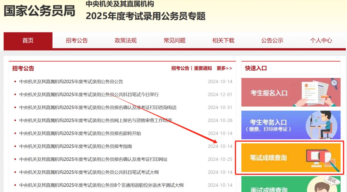 报考者可于2025年1月登录专题网站查询笔试成绩和合格分数线,具体时间另行通知。