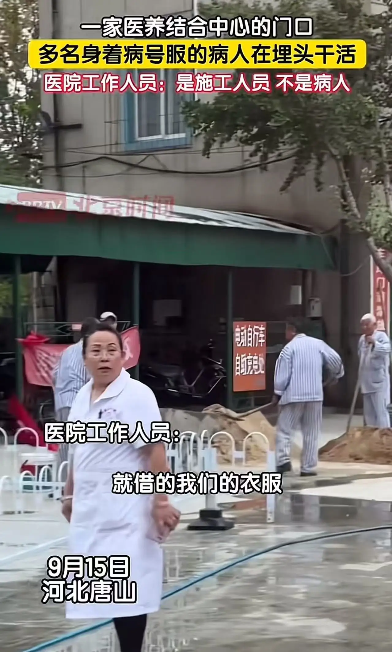 笑不活了!河北唐山icon,一家医养结合中心的门口,多名身着病号服的“病人”在埋头干活,网友炸锅,怒斥医院为了省钱让病人干活,可医院回应:“不是病人,是施工人员借我们的病号服在干活!”网友:第一次听说干施工队的怕身上弄脏的,真是旷古奇闻!