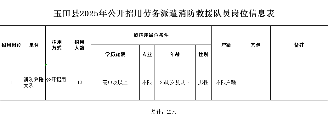 3、玉田县公开招用劳务派遣消防队员12人。
